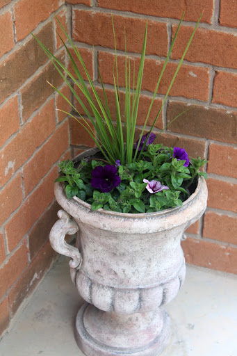 В этом году мы не стали покупать готовый горшок для вазы у входа. Я сама в него посадила, чего хотела. Это "чего хотела" тоже было куплено на прошлой неделе. Петуния, когда подрастёт, будет свисать вниз.