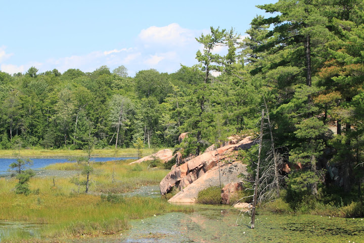 Сначала их было мало, а потом становилось всё больше и больше. Периодичсски появлялись и каменные горки. Через какое-то время мы дошли до озера Cranberry Bog Lake. Озеро слегка заболочено и на нём просто море кувшинок.