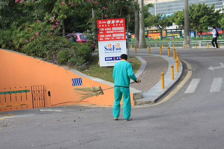Наша фирма в Шензене размазана по довольно большой площади. Примерно штук 30 зданий, в каждом минимум 5 этажей. Между зданиями разбит очень красивый парк с озером. В озере плавают рыбки от совсем крошечных до огромных, с метр длиной. Народ после обеда ходит их подкармливать. Дно озера сделано ступеньками, тянущимися вдоль берега, за счёт чего рыбки отсортированы по размеру (большие не могут заплыть туда, где мелко, а средние - туда, где совсем мелко). Вокруг озера и зданий просто море цветов и интересных тропических растений. Травка и кустики очень аккуратно подстрижены. Только не подумайте, что стригут эту огромную территорию газонокосилками. Нет. Дешевле нанять пару десятков китайцев с ножницами, чем покупать какую-то технику. Всё делается вручную. И делается очень качественно - территория просто вылизана. К сожалению, на территорию этого городка нельзя вносить фотоаппараты, так что фоток оттуда не будет. Всё было снято за пределами рабочей территории, на обычных городских улицах.